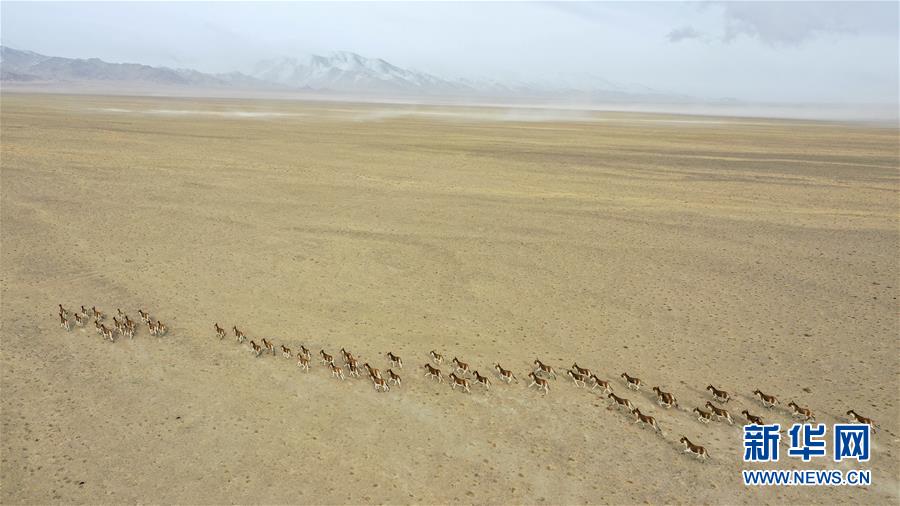 藏野驴奔跑在阿尔金山国家级自然保护区内(3月31日无人机拍摄)。 新华社记者 胡虎虎 摄