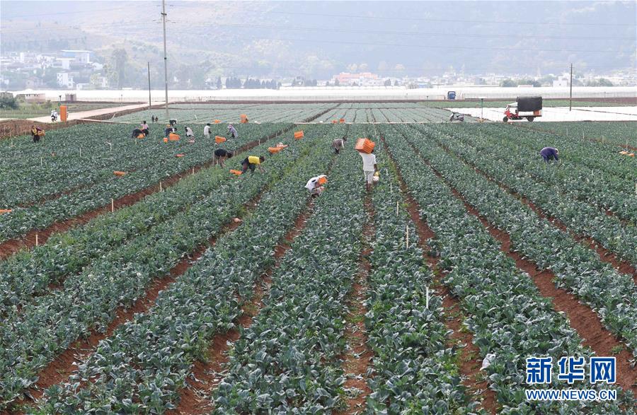 4月8日,云南弥勒市竹园镇那庵村的农民在蔬菜种植基地劳作。 云南省红河哈尼族彝族自治州弥勒市大力发展高原特色蔬菜种植,2018年全市蔬菜种植面积达25.84万亩,产品畅销多个省市,带动农民增收致富。2019年第一季度,弥勒市种植各种时鲜蔬菜已达12.51万亩。 新华社记者 杨宗友 摄