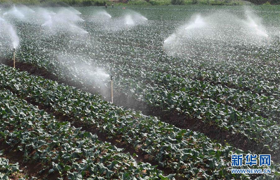 云南弥勒市竹园镇那庵村的蔬菜种植基地在进行自动喷灌浇水(4月8日摄)。 云南省红河哈尼族彝族自治州弥勒市大力发展高原特色蔬菜种植,2018年全市蔬菜种植面积达25.84万亩,产品畅销多个省市,带动农民增收致富。2019年第一季度,弥勒市种植各种时鲜蔬菜已达12.51万亩。 新华社记者 杨宗友 摄