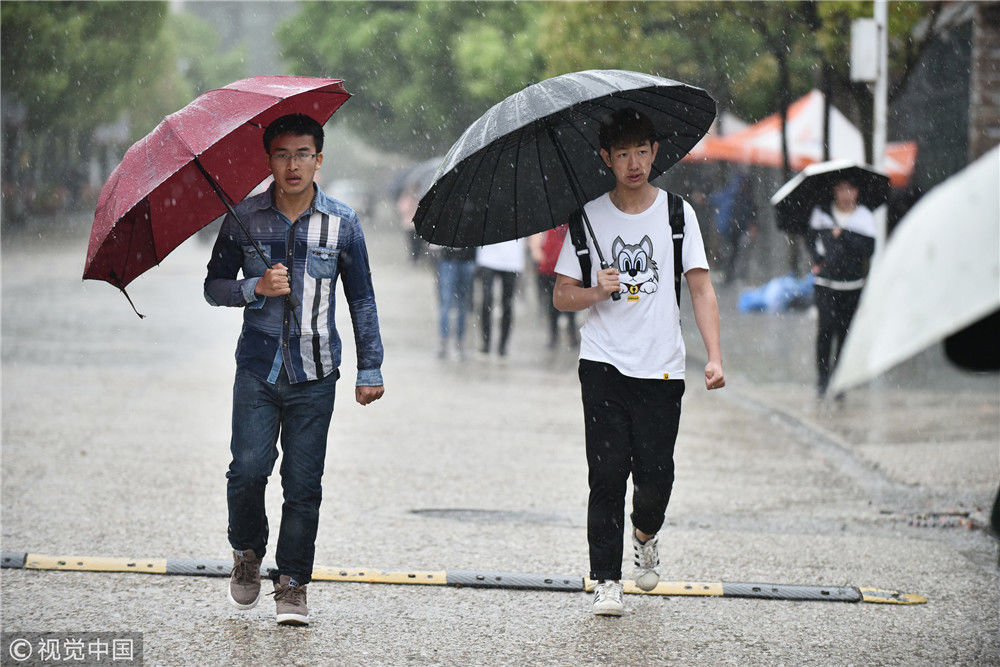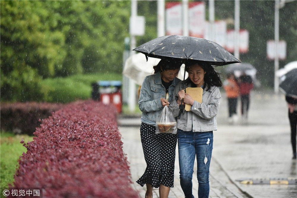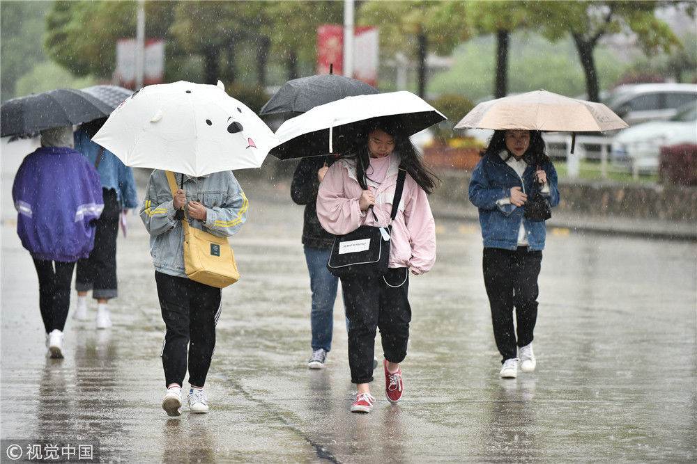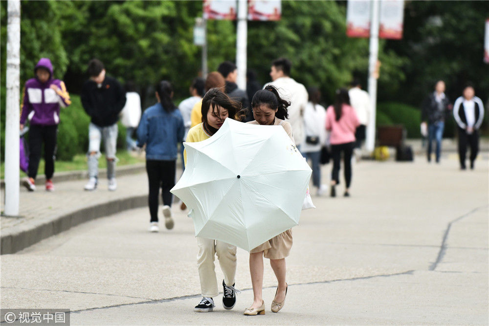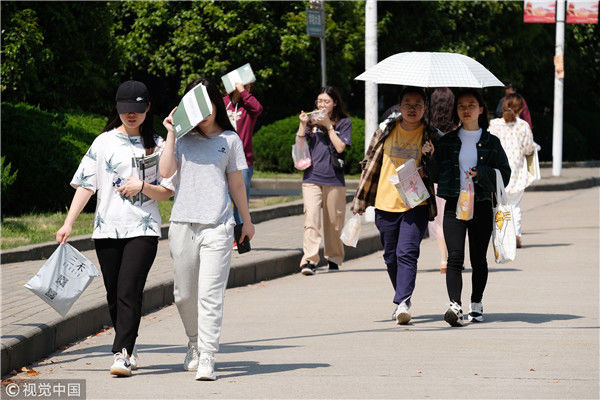 2019年4月8日,武汉,校园的学生换上清凉夏装,用书本、太阳伞、外套遮挡太阳光出行。