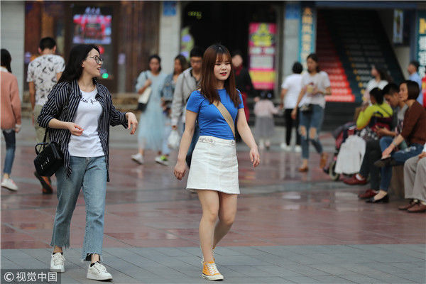 2019年4月8日,重庆市沙坪坝区三峡广场,市民着夏装出行。