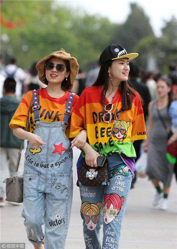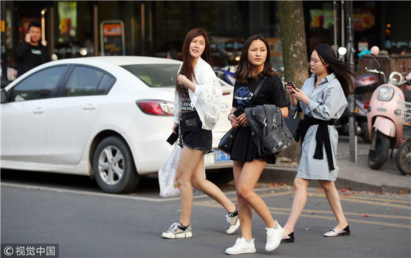 2019年4月8日,在江苏省南通市区街头,年轻人穿着春装出行。