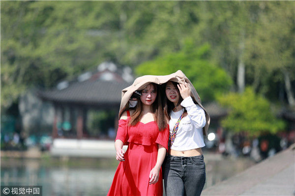 2019年4月8日,杭州热浪袭人,气温最高升到34℃,在西湖边,有的游客干脆穿起了T恤和短裤,女士则穿上了漂亮裙子。