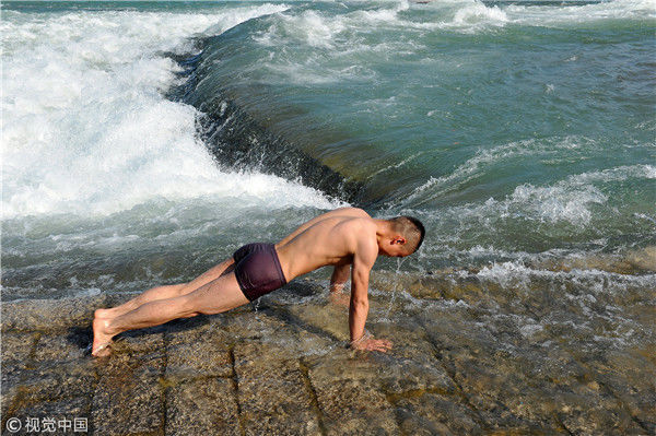 2019年04月08日,浙江金华开发区苏孟乡梅溪铁堰的溪流旁,一位年轻男子在做游泳前的热身。当日,金华春光明媚,气温继续飙升,下午2时许,气温达到了34℃。不少民众来到梅溪嬉水。