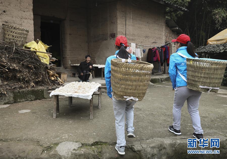 陶家镇友爱村18社五保户朱崇德家,小儿麻痹症患者朱崇德(左)在自家门前迎接上门体检的“背篓医生”(2月20日摄)。 新华社记者 兰红光 摄