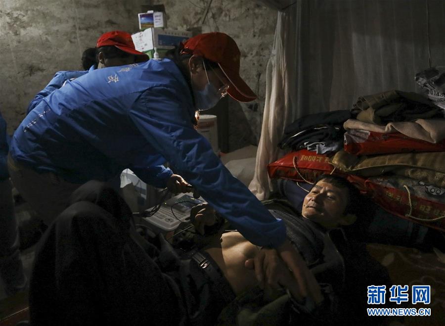 陶家镇友爱村18社五保户朱崇德家,小儿麻痹症患者朱崇德(右)躺在床上接受“背篓医生”上门体检(2月20日摄)。 新华社记者 兰红光 摄