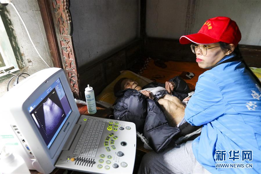 陶家镇治安村18社刘宴清侄女家中,“背篓医生”在操作医学仪器为100岁的老人刘宴清(左)进行体检(2月20日摄)。新华社记者 刘潺 摄