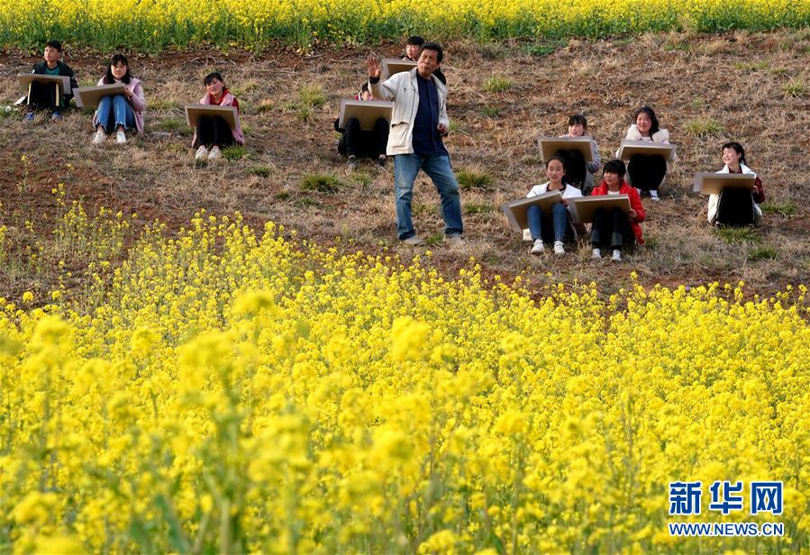 在洛宁县罗岭乡“爱和小镇”内,郭爱和(站立者)在指导学生画春日美景(3月25日摄)。 这里是河南省洛宁县罗岭乡前河村,它的另一个名字更为人熟知——“洛阳三彩陶艺村”,又称“爱和小镇”。经过艺术雕琢的山村,仍保留着醇厚的天然趣味,山间芳树遍植,传统民房、窑洞点缀其间,以陶缸为原料的创意作品随处可见,每年吸引数十万人前来观光。 新华社记者李安摄