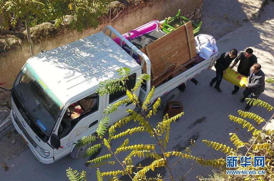 在陇南市武都区坪垭藏族乡旧墩村,村民将物品装车准备搬迁下山(10月31日无人机拍摄)。 新华社记者 范培珅摄