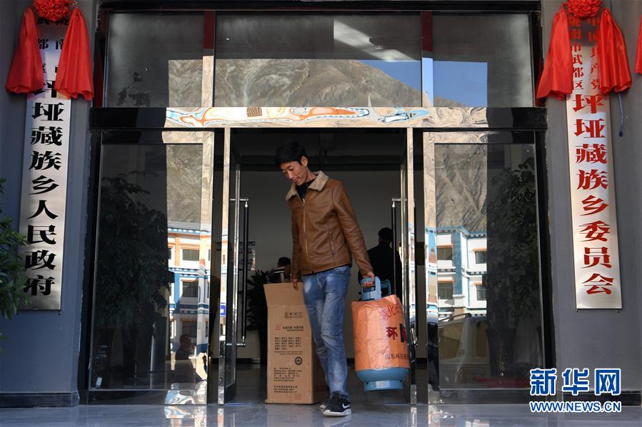 在陇南市武都区“新坪垭”,村民到乡政府领取帮扶单位赠送的灶具(10月31日摄)。新华社记者 范培珅摄