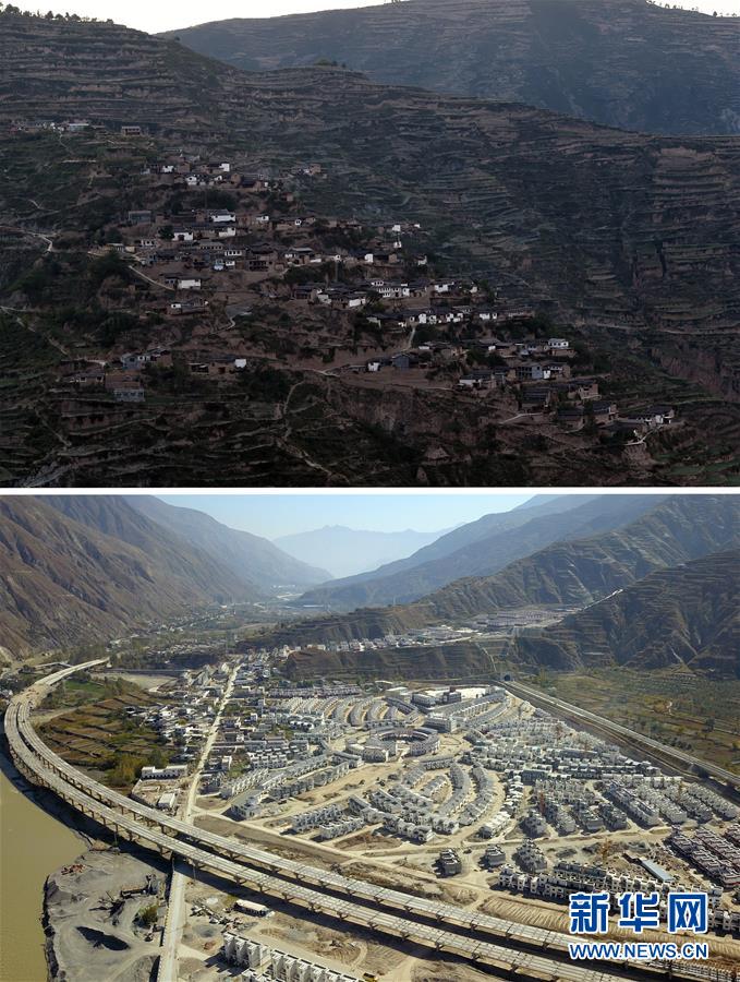 这是一张拼版照片。上图为陇南市武都区坪垭藏族乡腰道村全景(2016年9月1日摄);下图为陇南市武都区的“新坪垭”全景(10月31日无人机拍摄)。历经3年多的建设,在甘肃省陇南市武都区白龙江畔,一个崭新的“新坪垭”即将建成,预计今年年底实现全面建成搬迁。 坪垭藏族乡是甘肃省陇南市25个特困片区乡镇之一,2015年,当地政府做出坪垭藏族乡易地扶贫搬迁重大决策,对深山上的8个村1236户5731人实施易地扶贫搬迁,总投资4.69亿元,是甘肃省“十三五”时期易地扶贫搬迁工程重点建设项目。 全面建成搬迁后,当地政府将对搬迁安置区与周边景区进行整体规划,打造民族风情和乡村生态旅游村;同时加大群众专业技能培训,并引进企业实现群众本地就业,帮助搬迁群众增收致富。新华社记者 范培珅摄