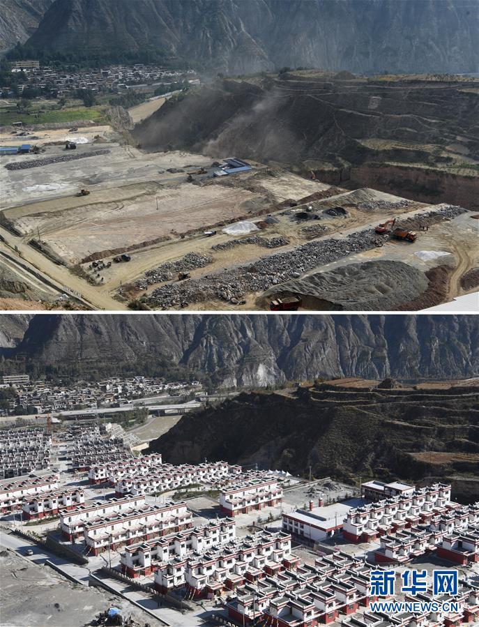这是一张拼版照片。上图为:陇南市武都区坪垭藏族乡易地扶贫搬迁项目建设现场(2016年9月1日摄);下图为:同一角度拍摄的陇南市武都区坪垭藏族乡易地扶贫搬迁项目现场(10月31日摄)。新华社记者 范培珅摄