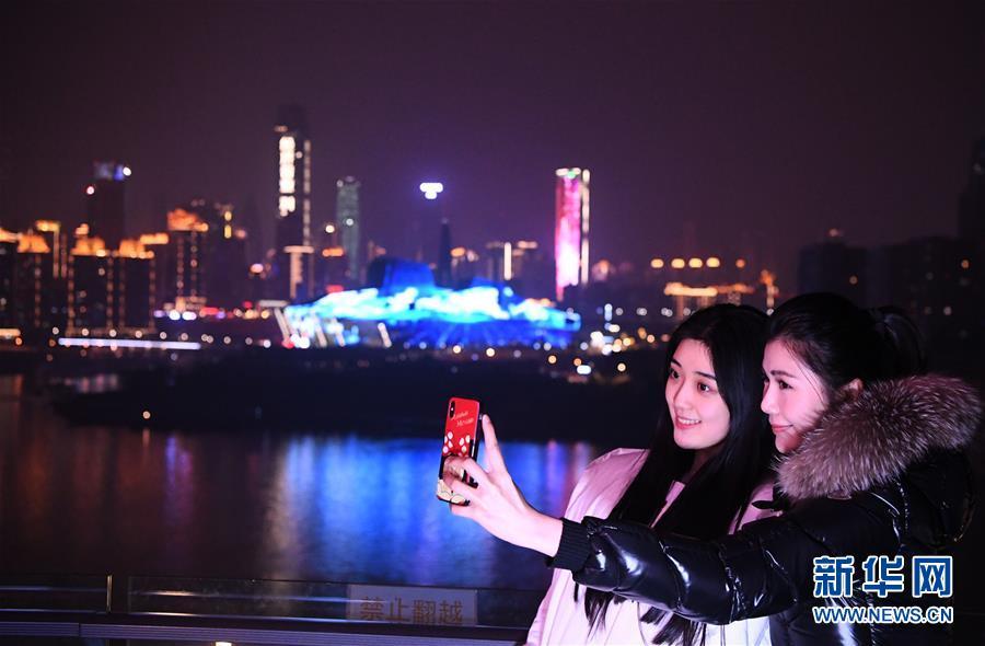 游客在重庆市南岸区街头合影留念(1月1日摄)。千里为重,广大为庆。城在山水间、山水在城中,重庆颇具特色的立体城市景观是城市靓丽的名片。新华社记者王全超摄