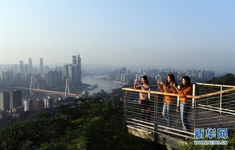 游客在位于重庆市南岸区的一棵树观景台欣赏城市风光(2018年10月10日摄)。千里为重,广大为庆。城在山水间、山水在城中,重庆颇具特色的立体城市景观是城市靓丽的名片。新华社记者王全超摄