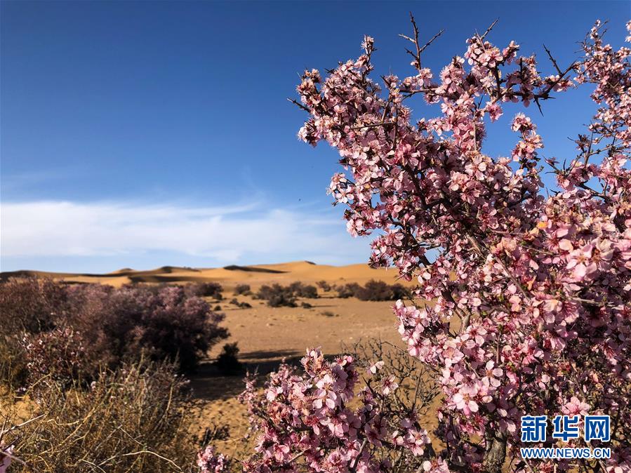 阿拉善盟腾格里沙漠腹地盛放的蒙古扁桃(4月12日摄)。蒙古扁桃生长缓慢,一株近1米高的蒙古扁桃需要20多年的生长时间。