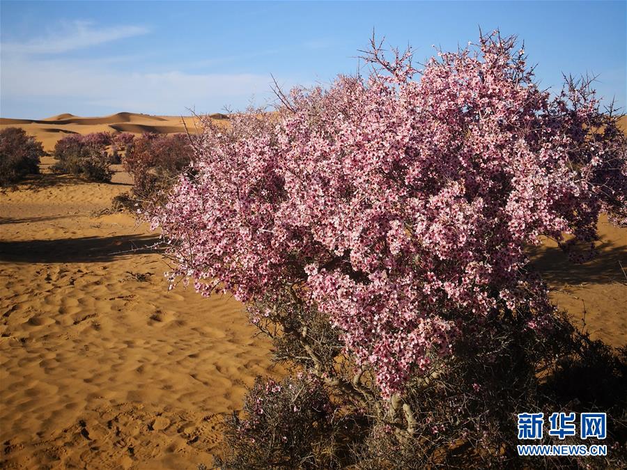 阿拉善盟腾格里沙漠腹地盛放的蒙古扁桃(4月12日摄)。蒙古扁桃生长缓慢,一株近1米高的蒙古扁桃需要20多年的生长时间。