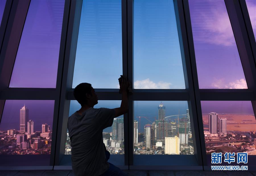 4月10日,在斯里兰卡科伦坡,工人在莲花电视塔进行清理工作。