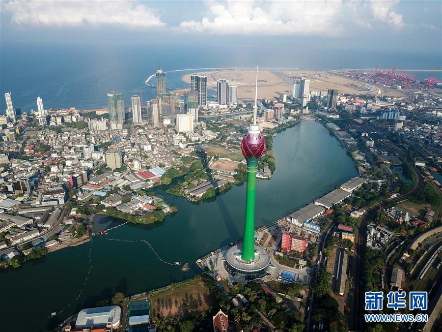 这是无人机航拍的斯里兰卡科伦坡莲花电视塔(4月10日摄)。