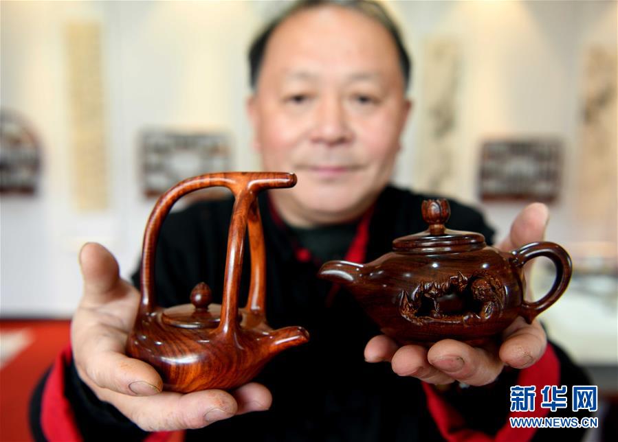 4月12日,桂雪在工作室内展示自己的木壶作品。家住安徽省宣城市泾县泾川镇岩潭村的桂雪是安徽省宣城市非物质文化遗产木壶艺术的技艺传承人,一块块不起眼的木头,经过他的雕琢打磨,变身一把把古朴典雅的袖珍木壶。近10年来,桂雪潜心研究木壶工艺,逐渐摸索出自己的木壶制作技艺。桂雪说,制作一件木壶需要经过选料、制胚、掏堂、凿把、修边、琢磨、抛光等十几道工序,制作难度大,工期长。桂雪至今只做了约200把木壶。近年来,桂雪通过非遗展示、讲课交流等方式弘扬传统木壶技艺,让更多的人了解了这门手艺。新华社记者 刘军喜 摄