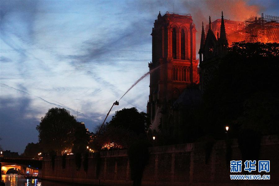 4月15日,在法国首都巴黎,消防员在巴黎圣母院火灾现场灭火。位于法国首都的巴黎圣母院15日傍晚发生大火,目前暂无人员伤亡的报告。新华社记者杨一苗摄