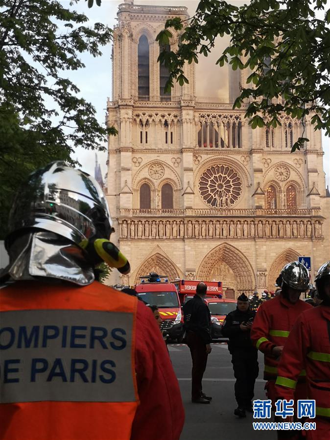 4月15日,在法国首都巴黎,救援人员聚集在发生大火的巴黎圣母院附近。位于法国首都的巴黎圣母院15日傍晚发生大火,目前暂无人员伤亡的报告。新华社记者杨一苗摄