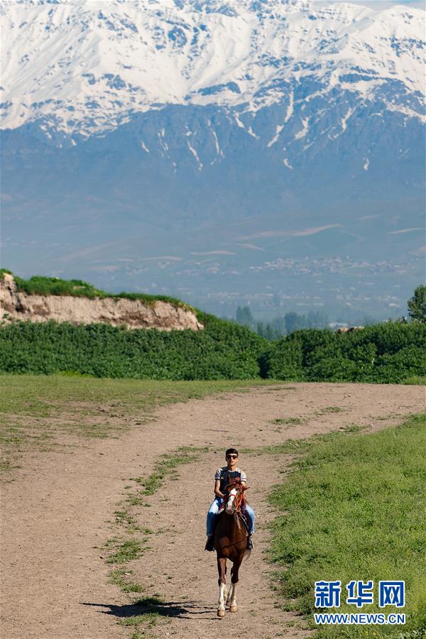 4月14日,在塔吉克斯坦首都杜尚别以西的吉萨尔城堡,一名男子骑马游览。新华社记者白雪骐摄