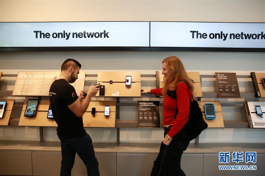 4月8日,在美国芝加哥一家威瑞森商店,一名顾客(右)向店员咨询5G手机。