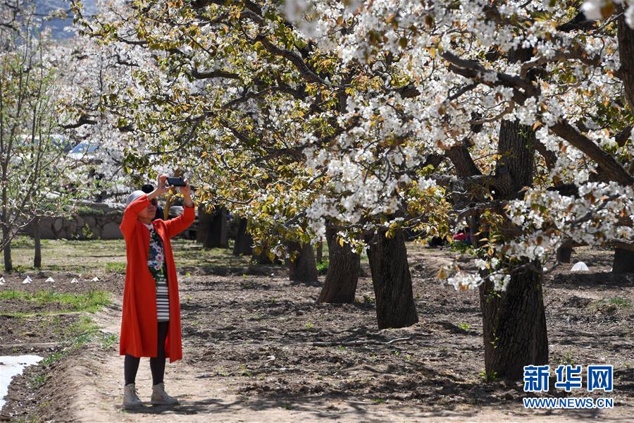 4月16日,游客在皋兰县什川镇古梨园赏花拍照。 近日,位于黄河上游的甘肃省兰州市皋兰县什川镇古梨园的梨花正值花期,吸引众多游客前来赏花踏青。据介绍,什川古梨园有数百年历史,现存梨园面积12000余亩。 新华社记者 范培珅 摄