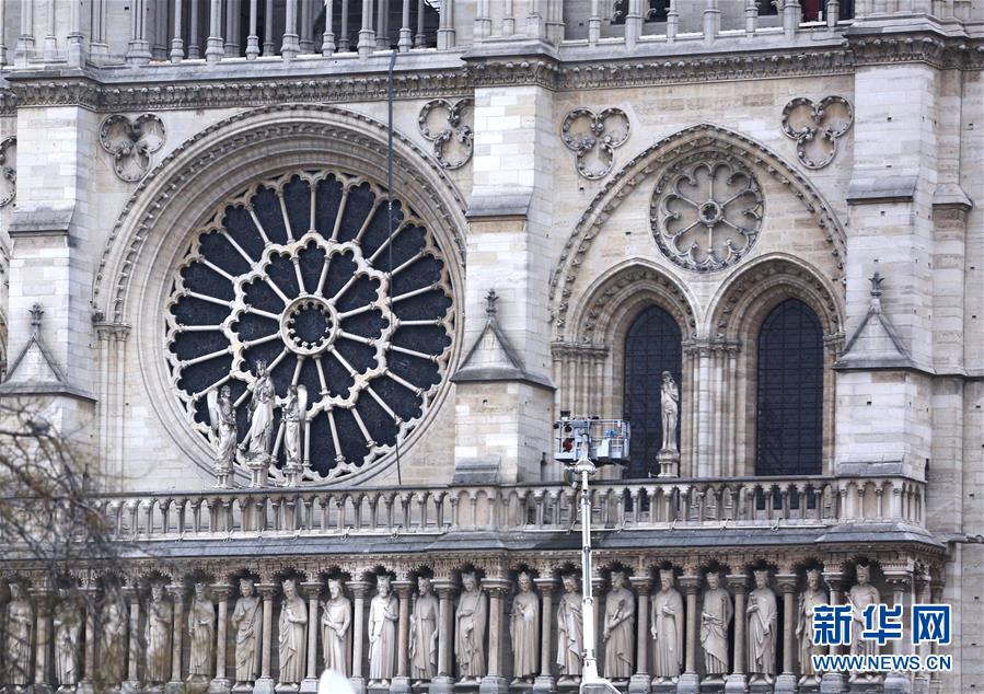 4月16日,在法国巴黎,火灾后的巴黎圣母院前架起升降机。新华社记者高静摄