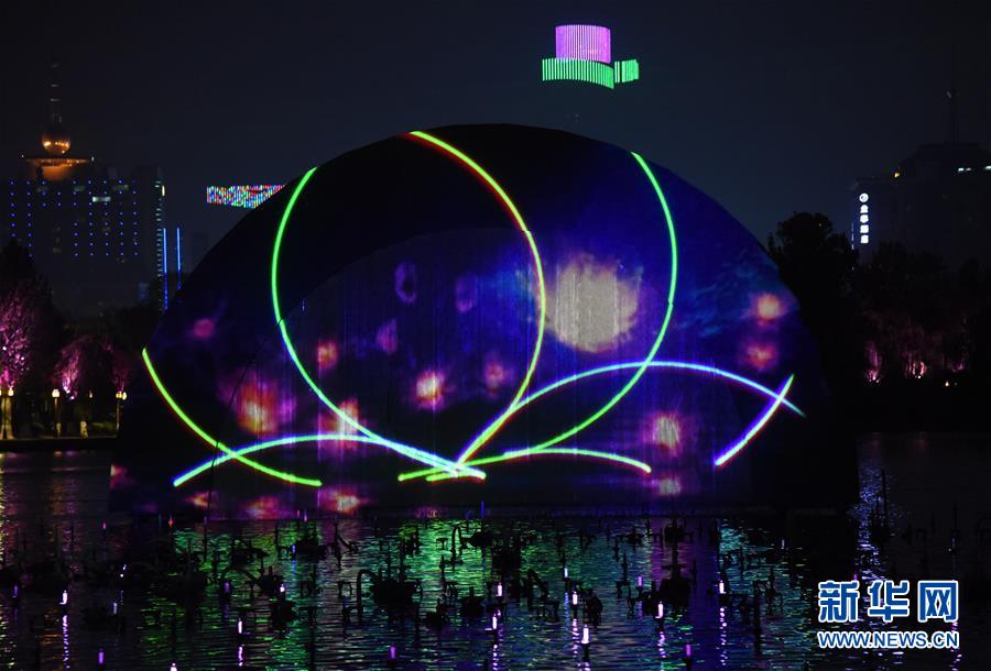 这是“泉城夜宴·明湖秀”的演出现场(4月16日摄)。 当晚,“泉城夜宴·明湖秀”在山东济南大明湖景区内举行今年的首次演出。“泉城夜宴·明湖秀”是以泉城济南浓厚的历史文化和秀丽的自然风光为创作源泉,深入挖掘济南的泉水特色及人文元素而精心打造的一台大型水上动态实景表演。 新华社记者 王凯 摄