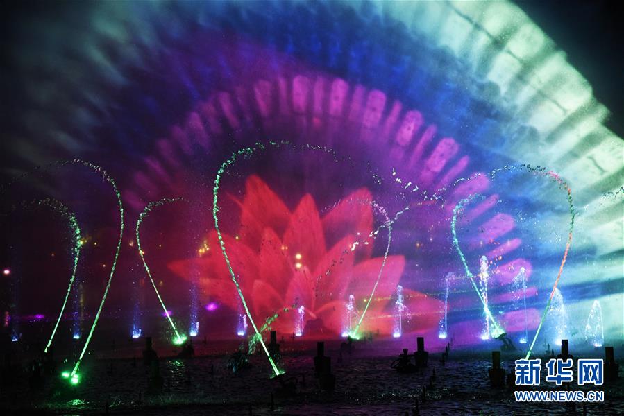 这是“泉城夜宴·明湖秀”的演出现场(4月16日摄)。 当晚,“泉城夜宴·明湖秀”在山东济南大明湖景区内举行今年的首次演出。“泉城夜宴·明湖秀”是以泉城济南浓厚的历史文化和秀丽的自然风光为创作源泉,深入挖掘济南的泉水特色及人文元素而精心打造的一台大型水上动态实景表演。 新华社记者 王凯 摄