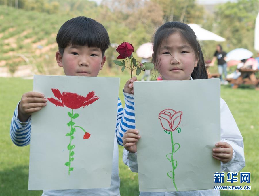 4月17日,埭溪镇中心幼儿园的孩子展示他们画的玫瑰花。