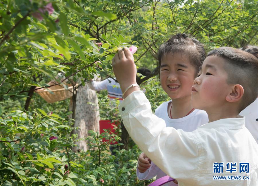 4月17日,埭溪镇中心幼儿园的孩子在玫瑰园体验玫瑰采摘。