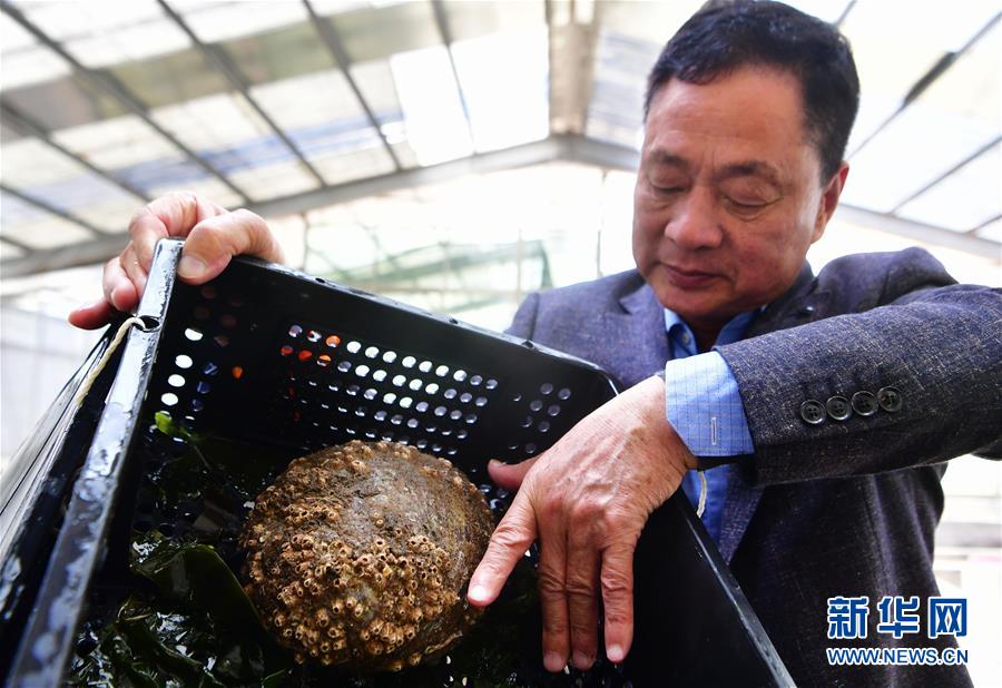 4月18日,连江县筱埕镇一家鲍鱼养殖育种企业的技术人员展示新培育的美国绿鲍新品种。