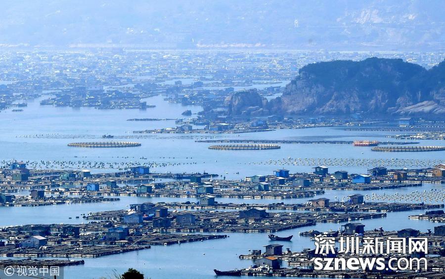 2018年10月26日,在福建连江海域上,“海上田园”网箱罗列,渔排上搭建的木屋错落成“户”,蔚为壮观,成为一道独特的风景线。福建省连江县是中国鲍鱼养殖第一大县。