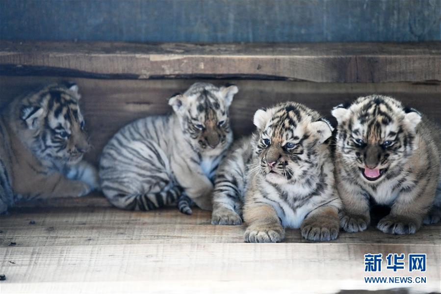 4月19日,在横道河子东北虎林园的虎舍中,4胞胎虎宝宝靠在一起。 作为中国横道河子猫科动物饲养繁育中心的重要饲繁基地,位于黑龙江省海林市的横道河子东北虎林园从今年2月末至今已“添丁”20只。中国横道河子猫科动物饲养繁育中心是目前世界最大的东北虎人工饲养繁育基地,横道河子东北虎林园是其饲繁基地之一,目前有东北虎400余只。 新华社记者 王建威 摄