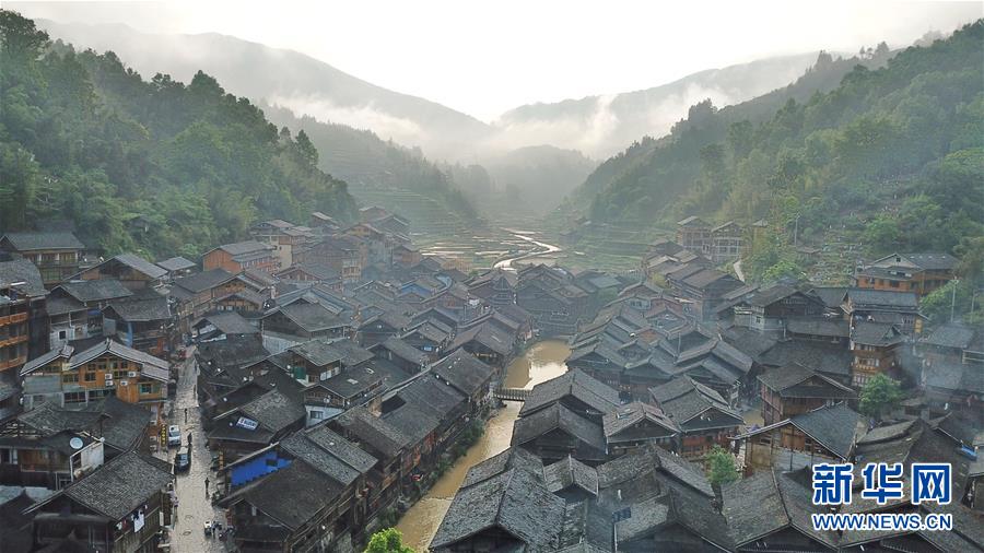 这是4月20日无人机拍摄的肇兴侗寨。 谷雨时节,贵州省黔东南苗族侗族自治州黎平县肇兴侗寨云蒸雾绕,美景如画。 新华社记者 欧东衢 摄