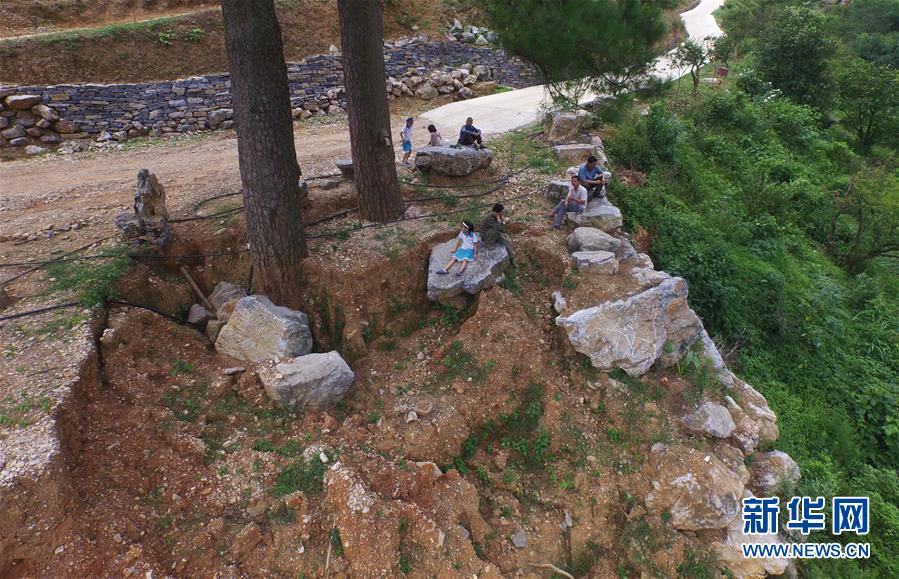 2015年7月22日,村民坐在村口的大树下休息,旁边的观景平台刚刚被山洪冲毁(无人机拍摄)。新华社记者 黄孝邦 摄