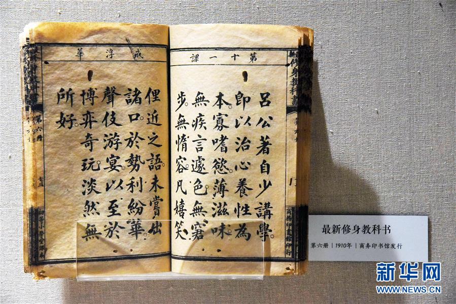 这是1910年商务印书馆发行的《最新修身教科书》(4月21日摄)。位于山东淄博市高新区的课本博物馆于2016年开馆,目前展出2万余件从清朝至今的课本原件,吸引众多游客前去参观。新华社记者 王凯 摄