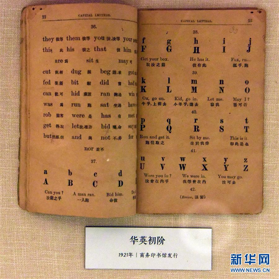 这是1921年商务印书馆发行的《华英初阶》(4月21日摄)。位于山东淄博市高新区的课本博物馆于2016年开馆,目前展出2万余件从清朝至今的课本原件,吸引众多游客前去参观。新华社记者 王凯 摄