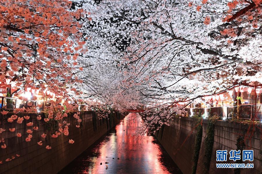 这是2019年4月3日在日本东京拍摄的目黑川沿岸樱花。 新华社记者杜潇逸摄