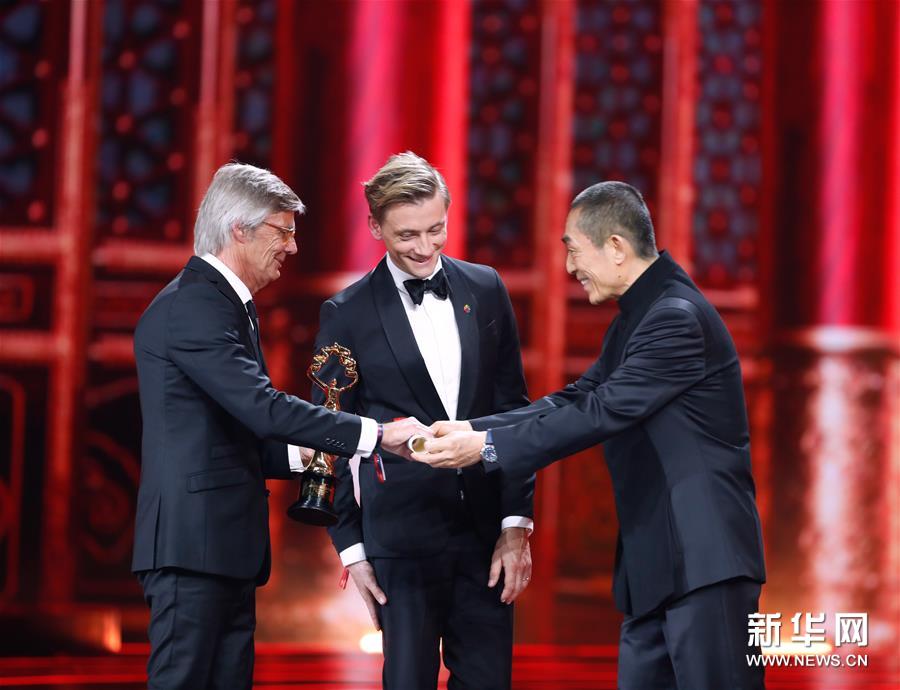 4月20日,影片《幸运儿彼尔》获得“天坛奖最佳影片奖”,张艺谋(右)为领奖者(左)颁奖。 当日,第九届北京国际电影节闭幕式暨颁奖典礼在北京怀柔国家中影数字制作基地举行。 新华社记者 沈伯韩 摄