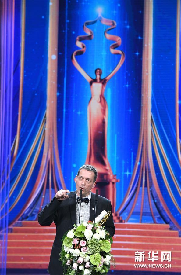 4月20日,影片《侍者》获得“天坛奖最佳音乐奖”,领奖者在颁奖典礼上发表获奖感言。 当日,第九届北京国际电影节闭幕式暨颁奖典礼在北京怀柔国家中影数字制作基地举行。 新华社记者 陈晔华 摄