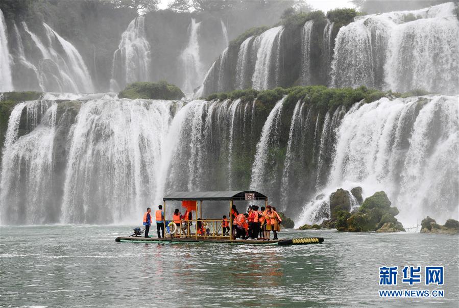 近日,随着降雨增多,位于中越边境的广西大新县德天瀑布水量增大,吸引大批游客前来观光游览。