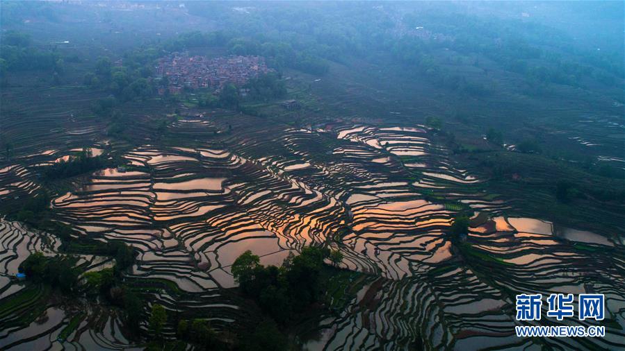 这是在云南省元阳县拍摄的傍晚时分的哈尼梯田美景(4月3日无人机拍摄)。 新华社记者 胡超 摄
