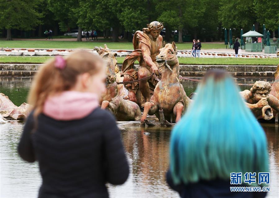 4月25日,在法国巴黎近郊,两个女孩在凡尔赛花园内欣赏喷泉。新华社记者高静摄