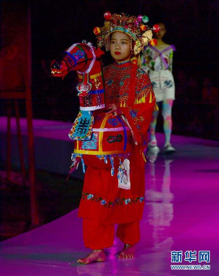 4月27日,小模特身穿民族服饰展示土楼当地的非物质文化遗产竹马戏。 当日,土楼光语国际时尚大秀在福建省南靖县的土楼裕昌楼内举行。这场融汇文化、时尚与旅游元素的大秀,通过传统与时尚的有机融合,展现南靖土楼及文化的魅力和风采。 新华社记者魏培全摄