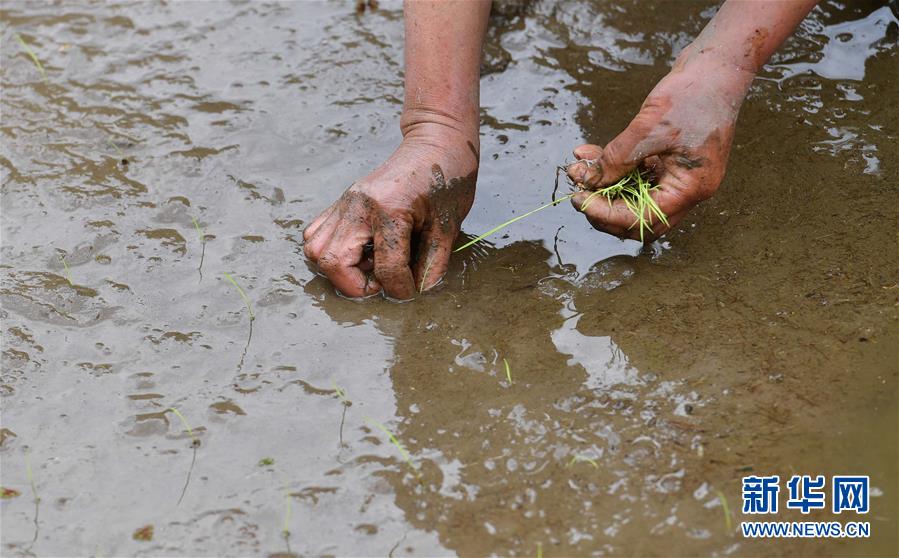 在黔桂乌英苗寨,村民在田间插秧(4月16日摄)。 新华社记者 黄孝邦 摄