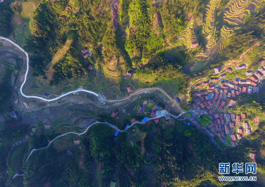 这是春耕时节的黔桂乌英苗寨梯田(4月16日无人机拍摄)。 新华社记者 黄孝邦 摄