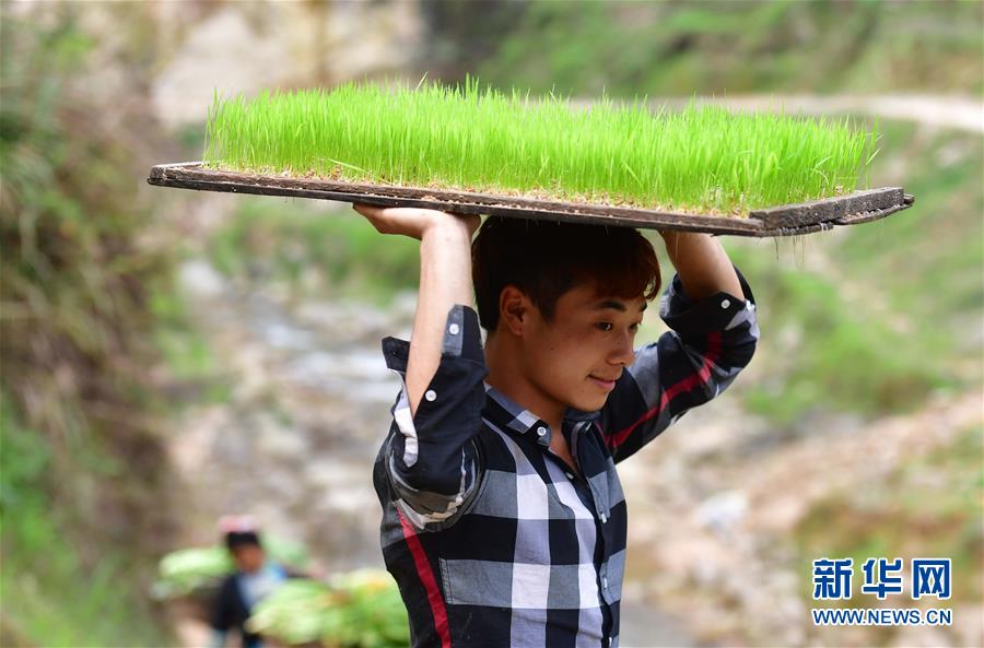 在黔桂乌英苗寨,村民搬运秧苗去插秧(4月17日摄)。 新华社记者 黄孝邦 摄
